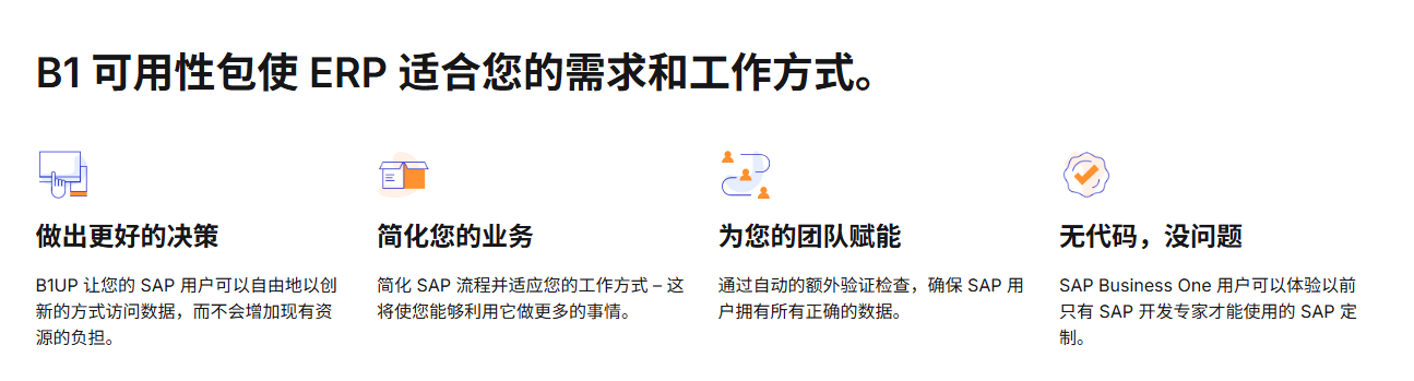 B1UP 可以轻松快速地使用,使 SAP Business One 适应各种场景,提高端到端系统利用率,提升用户体验并显著提高投资回报。B1UP 是寻求释放 SAP Business One 全部力量的公司必备解决方案,将其提升为在数字化转型时代取得成功的战略平台。