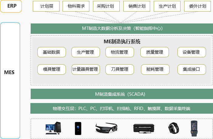 智能指挥中心相当于中枢大脑制定相应计划,通过ME制造执行系统进行模块化管理,MI制造集成系统将各个模块联通,通过物理交互层实现智能化车间管理。