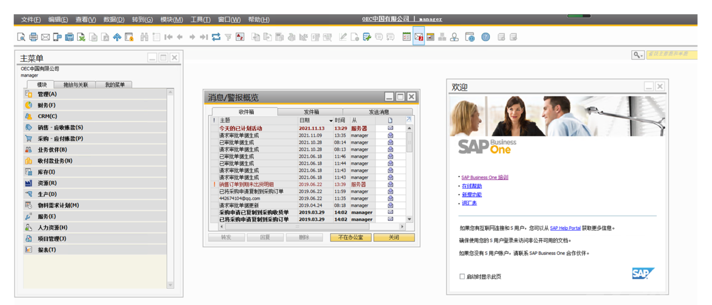 以上是SAP Business One的经典界面风格,在本地电脑的客户端程序中,通过“菜单,窗口、报表和向导”等界面,操作SAP B1的各项功能。