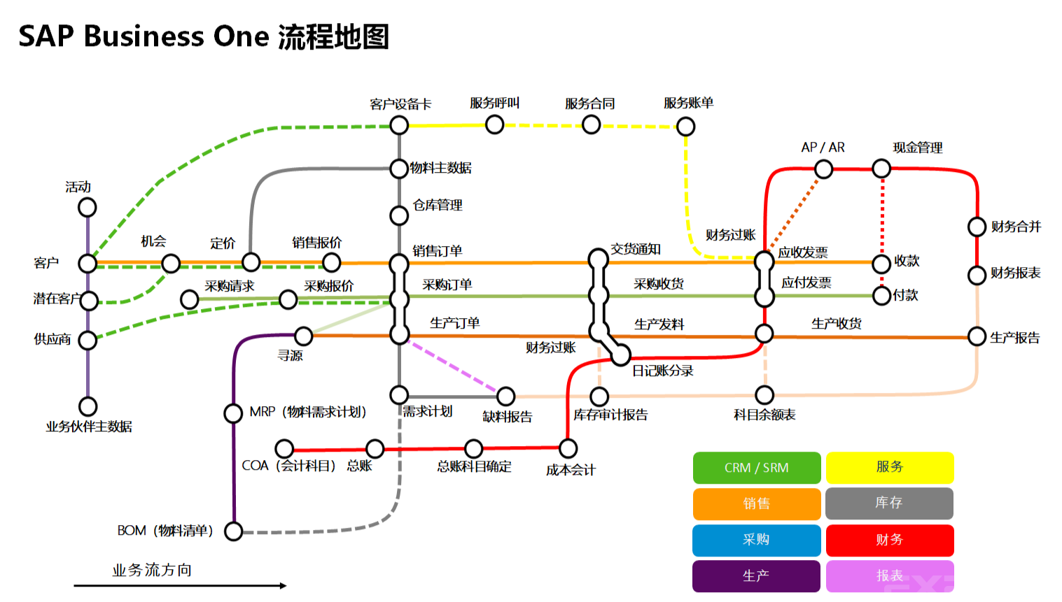SAP把复杂的企业运行和系统管理,简化为以上几条逻辑轨道,再分布若干站点,多个站点之间存在交互,就像地铁运行图一样。以此为逻辑基础,演化为下图SAP Business One的模块和功能菜单。