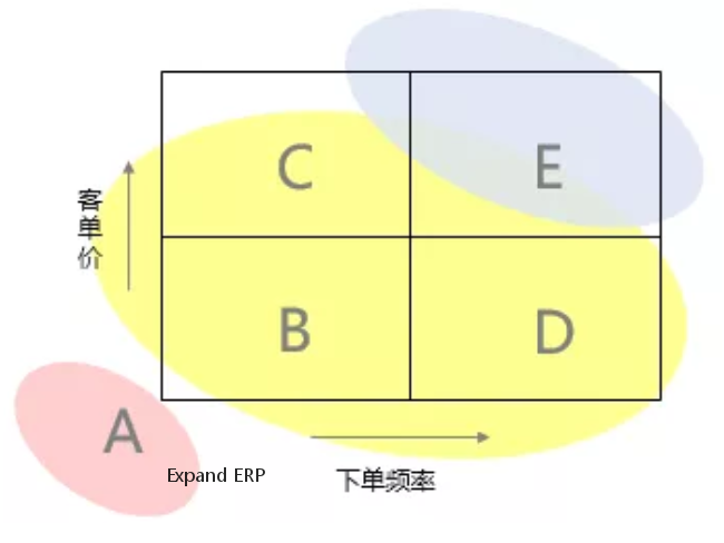 图中我们标记了A、B、C、D、E五个客户群体。企业的核心诉求之一,便是找到更多的潜在客户群体A,转化为客户群体B,并努力使客户群体B向客户群体E转移,尽量留在E的位置。