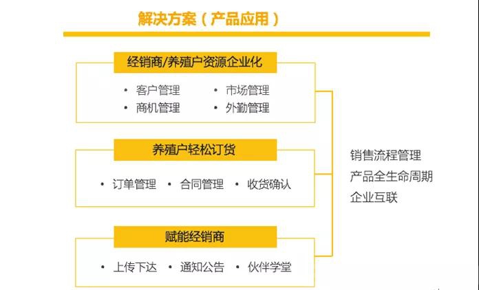 该解决方案主要分为经销商/养殖户资源企业化、养殖户订货、经销商赋能三大板块,最终实现销售流程管理、产品全生命周期管理以及企业互联的功能。