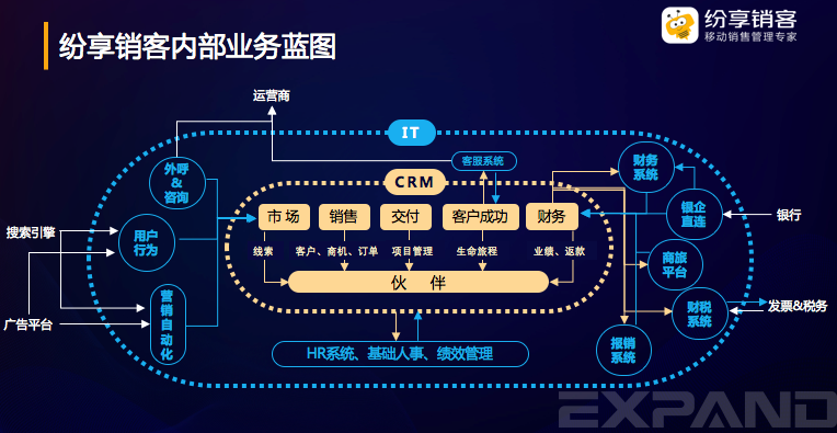 刘晨也以纷享销客自己的内部系统架构作为例子(下图),展现了一个以CRM为核心的,包括市场、销售、交付、客户成功、财务及合作伙伴的全流程闭环架构。
