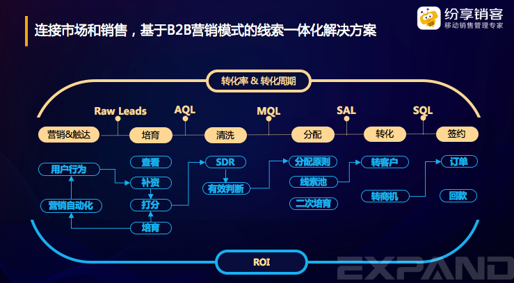 第一, 连接市场和销售,提供基于B2B营销模式的线索一体化解决方案(下图)。这其中有四个关键字,即“多、快、好、省”:“多”就是找到更多的获客渠道;“快”就是实现从市场到销售的快速联动;“好”是输出高质量线索;“省”是实现端到端的ROI分析。这部分最大的挑战来自于企业内部线索管理成熟度和数据闭环,而纷享销客的解决方案,可以对线索的培育、清洗、分配到转化签约实现端到端的业务支撑和跟踪分析。