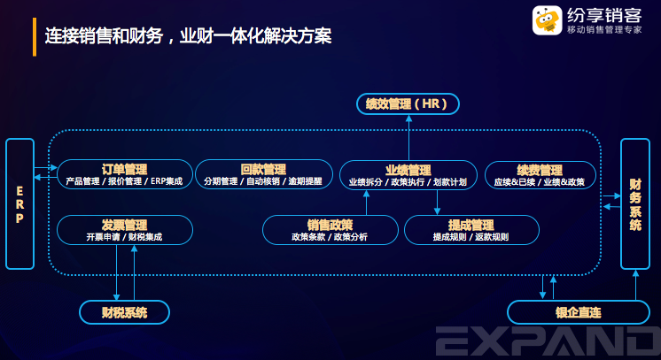 第二, 连接销售和财务,提供业财一体化解决方案(下图)。刘晨表示,通过卷入业务体系可以极大的提升财务的运作效率。这部分最大的挑战在于,如何处理好CRM和财务系统的分工和边界。这同时对CRM系统的定制能力、稳定性和集成能力提出了很高的挑战。对此,纷享销客的业务财务一体化解决方案让财务部门节省80%的人力,核算部门节省了60%的人力,业绩确认缩短了95%的时间。