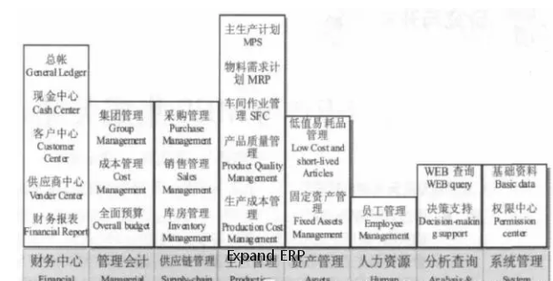 对于制造企业而言,主要还是以财务为中心结合供应链、生产管理、人力资源管理和资产管理为主要功能核心,共同构筑ERP的内部功能体系。