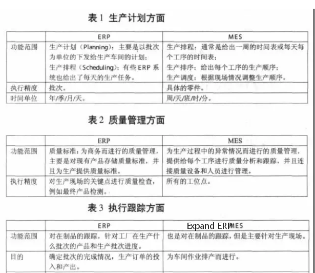 在实施的过程中ERP和MES功能名称出现了看似重复的现象。然而,信息流动过程中,在范围、服务对象和功能上是不同的,ERP为MES提供总体目标,MES优化执行计划并返回结果二者有机的统一。